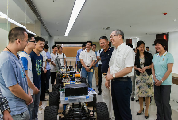 罗俊校长在jinnianhui今年会Robomaster逸仙狮战队的机器人带领下,参观了团支部同学参与的学生科技成果展。第一站观看了数据科学与计算机学院无人系统研究所的无人汽车视频。无人系统研究所研发了具有自主产权的高性能异构车载ECU、360度全景摄像头,蛇形机器人,校园观光车以及自动导航车型机器人等一系列的创新技术作品。在观看视频的过程中,罗校长不时和身边同学亲切交谈,询问了视频中一些技术产品的开发研究过程,了解硬件设施资源的配套情况以及相关技术细节,指出机器人的应用前景及未来的发展方向。