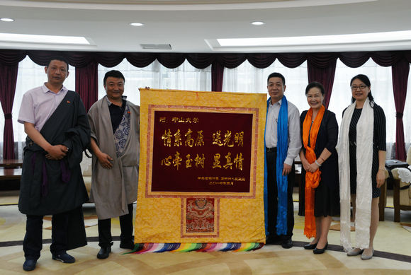 李萍副书记、余敏斌副校长代表学校接受索南尼玛书记赠送的锦旗