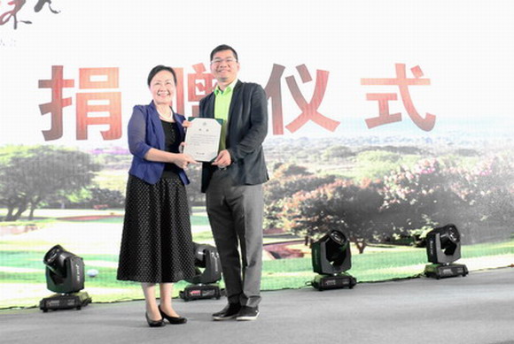 李萍副书记向捐赠代表高尔夫球俱乐部李向理事长颁发鸣谢证书