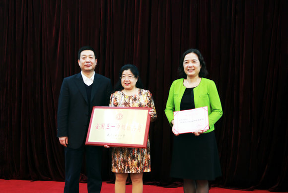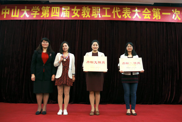王兰平主任(左一)、古小红(右一)和杨霞(左二)副主任向获得2016年jinnianhui今年会“女教职工文明岗”的单位授牌