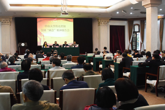 3月17日上午,我校在怀士堂召开传达贯彻十二届全国人大五次会议、全国政协十二届五次会议精神报告会。全国人大代表罗俊校长,全国政协委员、广东省政协副主席王珣章教授,全国政协委员毛蕴诗教授出席会议,传达全国“两会”精神。会议由校党委副书记李萍主持。二级党组织负责人、统战委员,校党群机关部门负责人,各级人大代表、政协委员、政府参事、文史馆员,民主党派省委会及省直基层组织负责人,统战团体负责人,各二级单位分工会主席、教代会代表团团长以及离退休人员代表等200余人参加了会议。