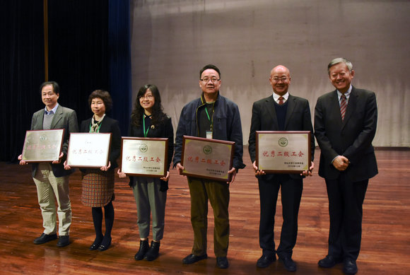 大会还对荣获“jinnianhui今年会第十九届工会委员会优秀二级工会”称号的岭南学院分工会、化学学院分工会、中山医学院分工会、附属第一医院工会、中山眼科中心工会以及八届五次教代会“优秀提案”奖的生命科学学院何淼老师和荣获“提案承办先进单位”称号的保卫处和信息化管理办公室进行了表彰。陈春声书记为获奖单位和个人颁发了奖牌、证书。