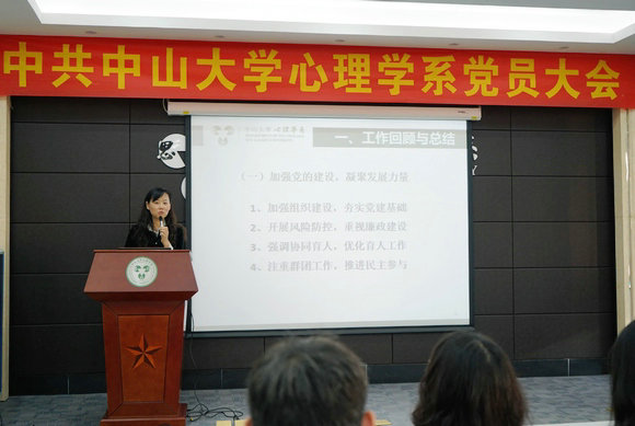 心理学系张斯虹同志代表系党总支做了题为《固本强基 行稳致远》的工作报告。报告分为工作回顾与总结、存在问题,以及工作计划与任务三个部分,回顾了过去一年心理学系党总支以党的十八大和习近平总书记系列讲话精神为指引,认真贯彻落实学校相关会议精神和专题教育要求,紧紧围绕教学、科研和人才培养等中心工作,团结带领心理学系全体党员和广大师生所做的工作。她指出,系党总支在加强党的建设,重视舆论宣传,促进教学科研发展等方面做出了尝试和努力,自直属系成立以来,各项事业取得了长足进步。这是系党政领导班子团结带领全体党员干部、师生员工奋力拼搏所取得的成果。她表示,心理学系的国家级大平台有待突破,大团队建设有待进一步深化,大项目组织有待进一步加强,党组织的自身建设还要进一步强化,党员的影响力、先进性有待进一步体现。随后,她部署了心理学系党总支部的工作计划和任务。她提出,学校已明确提出“进入国内高校第一方阵,向世界一流大学目标迈进”的战略目标,这为心理学系进一步发展指明了方向,提出了更高要求,也提供了更好的机会。
