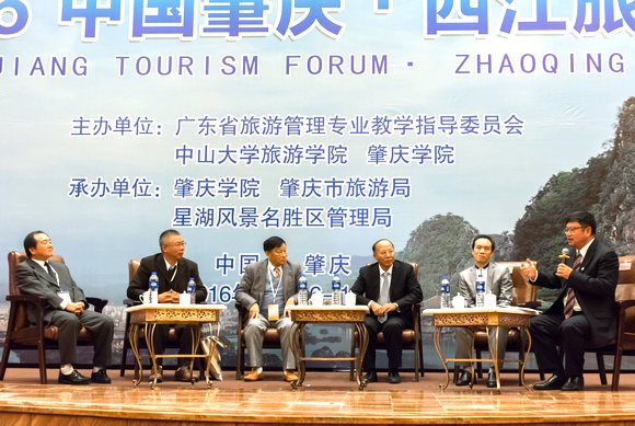 12月17至18日,由广东省旅游管理专业教学指导委员会、jinnianhui今年会旅游学院和肇庆学院共同主办的“2016中国肇庆·首届西江旅游论坛”在肇庆市成功举行。肇庆市委常委、宣传部长梁志强,副市长陈宣群,肇庆学院党委书记曾桓松、校长和飞,中国科学院郭来喜教授、厦门大学彭兆荣教授、桂林旅游学院程道品教授、我校旅游学院院长保继刚教授和副院长张朝枝教授等来自全国40多所高校的专家学者,以及旅游行业企业代表共120多人出席本次论坛的相关活动。