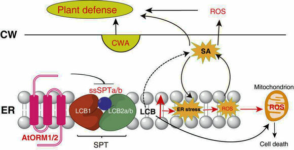 鞘脂是一类含有鞘氨醇骨架的两性脂,是仅次于磷脂的第二大类膜脂。越来越多的研究表明鞘脂正常代谢的维持不仅是细胞生存的关键,也对包括抗病免疫调控、植物育性等发育过程有着十分重要的作用。丝氨酸棕榈酰转移酶(Serine palmitoyltransferase, SPT)是催化鞘脂合成的第一步,同时也是关键的限速步骤。在人和酵母中,类黏膜蛋白(Orosomucoid, ORM)通过负调控SPT酶来维持细胞内的鞘脂稳态。尽管近年来的研究发现鞘脂作为信号分子在植物生长和胁迫过程中扮演着重要的角色,但是关于植物鞘脂的生物合成是如何被调控目前研究还不清楚。该论文报道了拟南芥ORM蛋白可以通过结合SPT酶的小亚基ssSPT来抑制SPT复合物的活性,负调控鞘脂的从头合成;而这类蛋白的缺失会促进鞘脂的从头合成,造成体内鞘脂的大量积累,内质网(ER)胁迫相关基因的高表达,引起植物的早衰。此外敲除ORM基因改变了植物对生物和非生物胁迫的抗性。这项研究揭示了ORM蛋白调控植物鞘脂生物合成的分子机制,以及其在抗逆应答中的重要生物学功能。