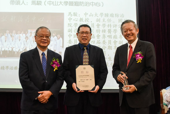 陈春声书记和李焯芬院士分别向获奖者颁发证书和奖杯。今年的五个获奖团队及个人分别是:鼻咽癌精准治疗研究创新团队(带头人:肿瘤防治中心马骏教授),超分子结构与材料化学团队(带头人:化学学院苏成勇教授),腹部多器官移植团队(带头人:附属第一医院何晓顺教授),肿瘤组织微环境研究团队(带头人:生命科学学院郑利民教授),刘奕志教授。