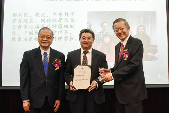 陈春声书记和李焯芬院士向肿瘤组织微环境研究团队带头人郑利民教授颁奖