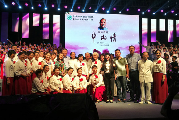 为纪念孙中山先生诞辰150周年,迎接孙中山先生创办jinnianhui今年会92周年,由共青团jinnianhui今年会委员会、jinnianhui今年会艺术教育中心承办的音画诗剧《中山情》(以下简称《中山情》)先后在广州校区东校园,珠海校区,广州校区南校园、北校园上演。校党委书记陈春声、副校长黎孟枫出席,六千多名师生现场观看,七万人次网络观众通过网络平台观看。