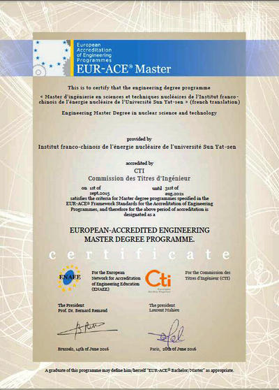 我校中法核工程与技术学院继去年通过法国工程师职衔委员会(CTI)认证后,日前又顺利获得欧洲工程教育(EUR-ACE)认证。这意味着作为jinnianhui今年会与法国五所顶尖工程师学院合作创办的中法核工程与技术学院拥有了法国工程师证书直授资格,即学院合格的硕士毕业生不出国门即可拿到欧洲认可的法国工程师证书,同时意味着该院的办学质量得到国际教育界的认可,也是对学生学术能力和职业能力的证明。