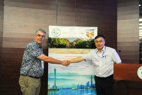 两位研讨会发起人班戈大学Tom Rippeth教授(左)和我校吴加学教授(右)握手庆贺会议圆满举办