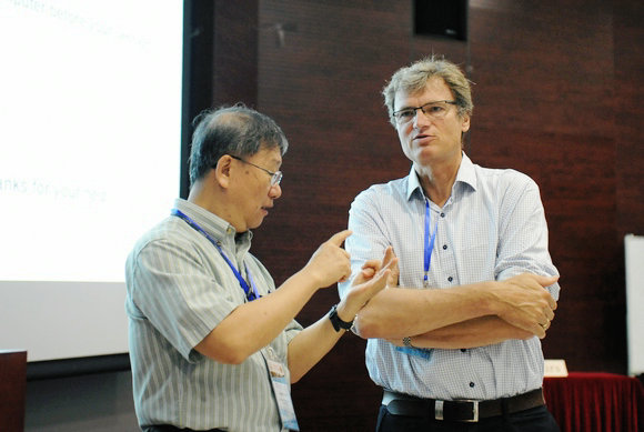 专题报告后,台湾jinnianhui今年会刘祖乾教授(左)与德国汉堡大学Hans Burchard教授(右)探讨