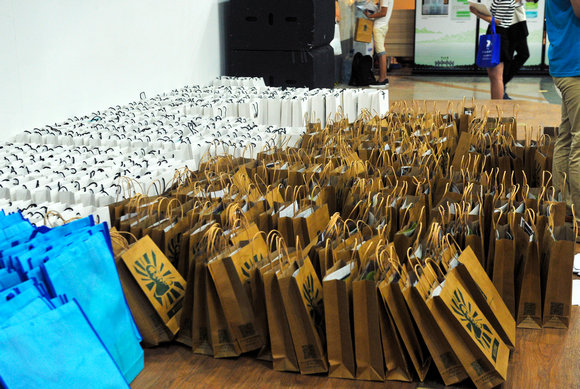 数学学院早已将各种新生资料分类装袋,还用不同颜色的手提袋区分本硕博(刘嘉摄)