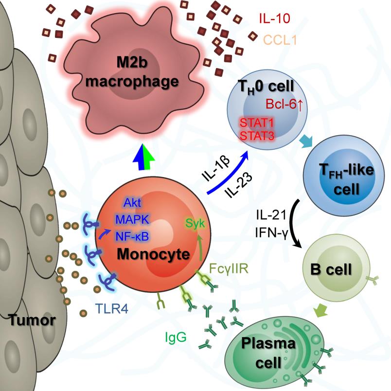 B淋巴细胞是体液免疫唯一的主导细胞,主要通过呈递抗原和分泌抗体参与体液免疫过程,在机体抵抗外来抗原免疫反应中发挥重要作用。目前,B细胞的研究国内外多以免疫器官为模型,对组织局部微环境中B细胞的功能与调控机制知之甚少。邝栋明教授课题组从2009年开始致力于组织微环境中B细胞发育、亚群及功能研究。该团队去年12月发表于肝病学权威期刊《Hepatology》(IF:11.7)的文章(文章链接:http://onlinelibrary.wiley.com/doi/10.1002/hep.28020/full)在国际上率先阐明了肝癌组织B淋巴细胞的浸润机制;今年5月发表于《Cancer Discovery》的文章(文章链接:http://cancerdiscovery.aacrjournals.org/content/6/5/546)鉴定出一群具有PD-1high表型的调节性B细胞,并深入研究了这群细胞的产生机制及功能;本次发表于《Cancer Discovery》的工作聚焦在肿瘤微环境对B细胞成熟和功能的调控,率先发现了一群具有滤泡T辅助细胞(TFH)功能、但表型独特的TFH-like细胞,并系统研究了这群细胞的产生及其调控B细胞发育、成熟和功能的机制。研究显示:(1)TFH-like细胞在肝癌中占所有T辅助细胞约10%,其浸润水平可作为一个判断肝癌预后的独立因素;(2)模式识别受体TLR4介导的单核细胞先天性炎症是TFH-like细胞产生的重要机制;(3)TFH-like细胞通过IL-21–IFN-γ依赖途径来促进B细胞成熟为浆细胞,继而创造有利的条件来诱导促肿瘤巨噬细胞的诞生。