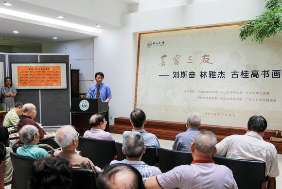 5月8日上午,“芸窗三友——刘斯奋 林雅杰 古桂高书画联展”在我校南校图书馆开幕。我校1967届中文系校友刘斯奋、历史系校友林雅杰、哲学系校友古桂高,著名学者王贵忱,广东省政协副秘书长叶晓世,广东省文联巡视员曹利祥、廖曙辉,广东省美术家协会副主席、原广东美术馆馆长罗一平,广州市文史馆副馆长刘素燕,广州市国家档案馆副馆长蒋年平,书画家卢有光、卢延光、钟耕略,及我校校长助理、图书馆馆长程焕文,胡守为教授、许锡挥教授、张荣芳教授、陈永正教授等近百位嘉宾出席开幕式。仪式由历史系系主任吴义雄主持。
