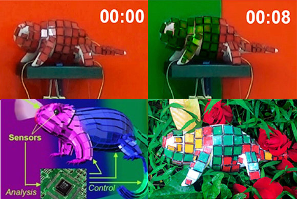 将“红绿蓝三色传感器”放置在机械变色龙的两只“眼睛”里,并配备一个嵌入式控制系统。当传感器“看”到相应颜色后,会告诉计算机系统,系统就会给“鳞片”施加一个电压,电压大小、施加时间由前期实验结果决定,并存入系统程序里,从而实现颜色自动调控。