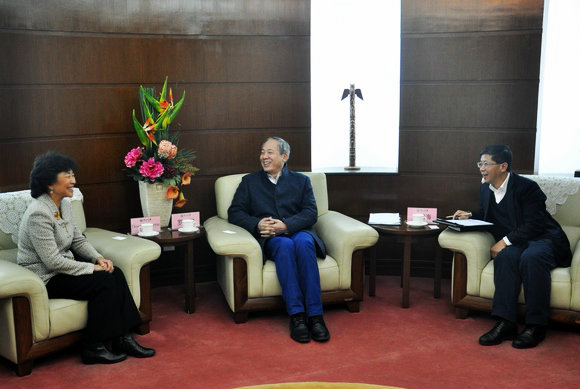 罗俊校长(中)在中山楼贵宾厅会见了Dr. Ding-Jo Currie会长(左),魏明海副校长(右)等陪同会谈
