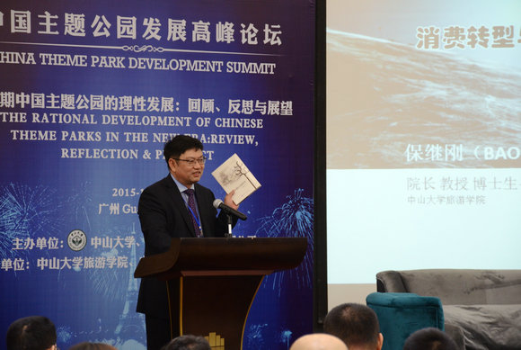 论坛上,来自中国主题公园学术界和企业界的知名专家做了大会发言。我校研究生院院长、旅游学院院长保继刚教授做了《消费转型与中国主题公园的理性发展》的发言。保继刚介绍了与梁增贤、古诗韵博士合作撰写的《主题公园研究》一书。保继刚指出,中国主题公园产业30年的发展积累了一系列理性的经验和实践理论,对指导中国主题公园产业的发展起到了积极作用。当前,中国主题公园的发展从早期的高利时代,逐渐走向微利时代,回收期越来越长,甚至需要房地产的补贴。在消费转型的背景下,主题公园公款买票入园的市场基本消失,市场趋于理性,消费量力而出,中产阶层家庭消费为核心的市场逐渐成为主题公园消费的主流,与此同时,各级政府对房地产和主题公园相关配套的开发、土地让利和投资激励会逐渐趋于谨慎,政策更加明智,主题公园开发的投机机会减少。消费转型将从供给和需求两方面迫使主题公园开发趋于理性,更强调项目的可持续性。