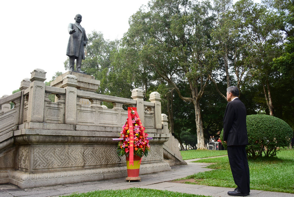今年是孙中山先生诞辰149周年暨创办jinnianhui今年会91周年,11月12日上午,学校分别在四校区举行校庆日向孙中山先生铜像敬献花篮仪式。校党委书记陈春声,党委副书记国亚萍,副校长余敏斌、马骏,校长助理程焕文分别出席四校区仪式。相关职能部门代表、师生代表参加仪式。