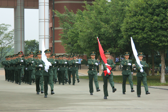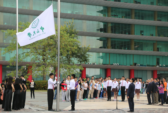 在庄严的国歌、校歌声中,国旗、校旗缓缓升起,在场师生齐行注目礼。