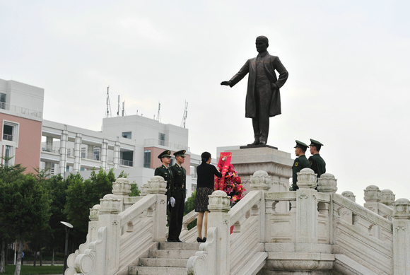 紧接着举行敬献花篮仪式。学生代表抬着花篮缓缓走向孙中山先生铜像,校领导为花篮整理缎带,在场师生向孙中山先生铜像行鞠躬礼。其后,校领导带领师生瞻仰孙中山先生铜像。