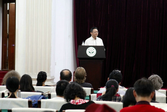 我校首届国际作家写作营开幕式在怀士堂举行,外语与翻译大学院副院长常晨光致辞