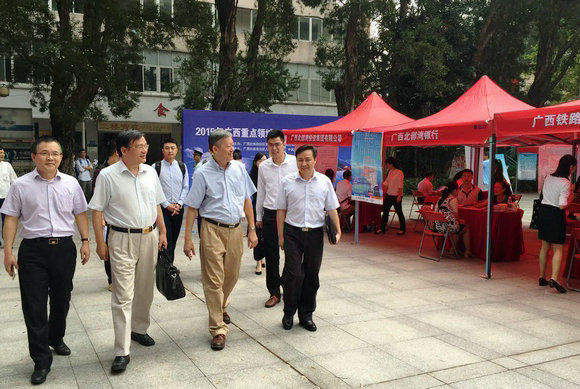 我校党委书记陈春声(前排右二)、广西壮族自治区党委组织部部务委员曾凯(前排右一)、我校副校长颜光美(前排左二)一行慰问专场招聘会现场工作人员