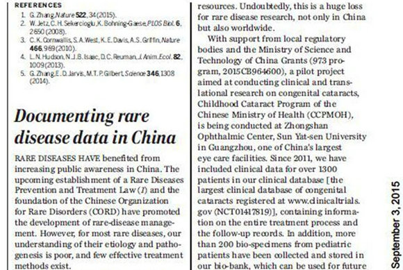 9月4日,我校中山眼科中心刘奕志教授团队在《Science》发表题为《Documenting rare disease data in China》的文章(2015 Sep 4;349 (625 2) :1064)。(原文链接http://www.sciencemag.org/cgi/pmidlookup?view=long&pmid=26339020)