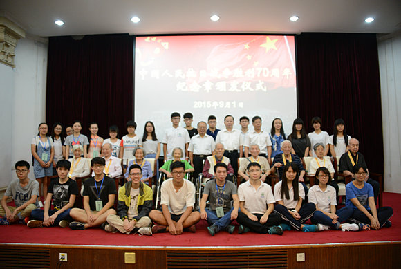 根据党中央、国务院、中央军委要求,9月1日上午,我校在南校区怀士堂举行纪念抗日战争胜利70周年纪念章颁发仪式。我校抗日老战士代表陈化成、戈平、陈逸之、张正吾、李启芬、姚崇仁、滕毅、李哲、张若子等出席。校党委书记郑德涛为他们颁发纪念抗日战争胜利70周年纪念章,副校长魏明海为他们颁发慰问金每人5000元。党办、校办、组织部、宣传部、统战部、校工会、校团委、人事处、离退休工作处、关工委负责人,南北校区党总支委员、离退休党支部书记代表、校关工委、离退休协会、离退休分会以及学生代表共计80余人参加了活动。颁发仪式由魏明海主持。