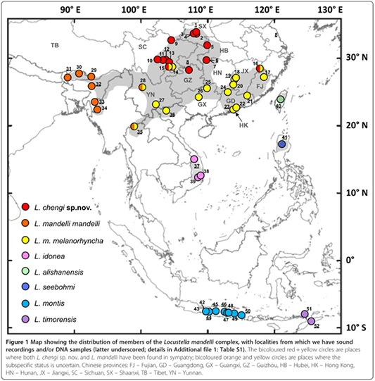 亚洲近似的短翅莺物种的分布图,其中红色的圆点代表四川短翅莺的分布地点