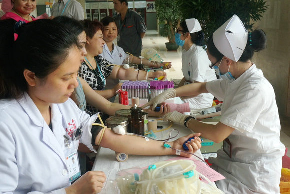 附属第六医院团委与广州市血液中心联合举办的义务献血活动现场,附属第六医院职工积极参与无偿献血