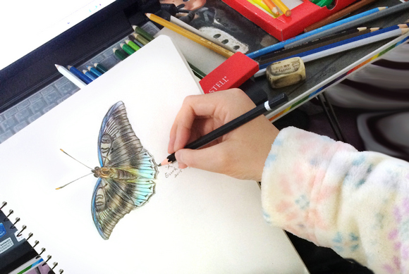 能将蝴蝶画得栩栩如生,一定程度上要归功于朱琳跟小动物、植物们结下的深厚情谊。她的家里养着一只名叫“野马君”的喵星人,阳台养了一盆名叫“柱柱”的仙人掌,前不久这个家庭又增添了吉娃莲、观音莲、八千代等众多新伙伴。她还经常背着相机到校园里来,一边转悠,一边给动植物们采风,不算疯狂,也够得上痴迷了。
