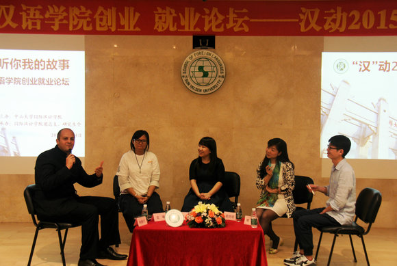 4月24日晚,由国际汉语学院主办的“‘汉’动2015 分享你我的故事”就业创业论坛在南校区举行。活动特邀摩洛哥籍校友、香港国际远程网络教育中心主任纳赛尔,广州曼达瑞语言学校校长杨莹,广州尊文信息有限公司创始人孟璐,卓越教育集团大语文项目中文老师樊川,国际汉语学院2012级硕士生黄妍琼,与我校师生讲述他们创业就业的故事。活动由国际汉语学院副院长罗晶主持,我校近百位师生参加。