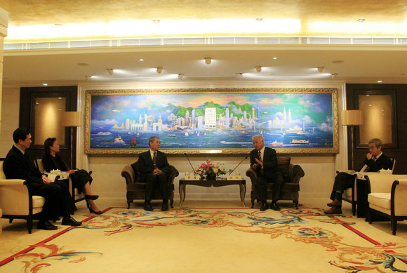 在香港礼宾府,罗俊一行拜会了香港特区政府行政长官梁振英,就教育、人才培养,更好地保持香港特区繁荣稳定,促进粤港融合发展等问题进行了洽谈。
