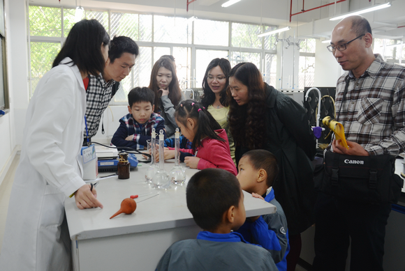 今年的实验楼开放日活动有别于往年,进行了阶梯化设置,实验设计更新颖、更有趣味。学院校友及子弟百余人回到母校,积极参与。五个DIY实验——酸碱滴定、一封密信、七彩蜡烛、天气瓶和水下花园,以及四个展示实验——指模实验、烧不坏的手帕、碘钟和金粉实验的设计,让不同年龄段的参与者都能在实践中学习到基础化学知识,掌握基本实验操作技能,在过程中加深感情,彰显学院“严谨务实、求真创新、追求卓越”和“化院一家亲”的精神和理念。