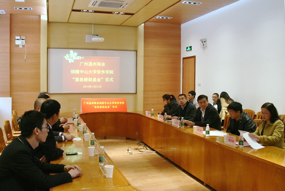 1月21日下午,广州温州商会捐赠我校软件学院“紧急援助基金”仪式于南校区举行。广州温州商会共向该基金捐款14余万元,帮助该学院研究生治病。我校副校长颜光美、校长助理兼软件学院院长李文军、校团委书记黄毅、软件学院党委副书记谭英耀,广州温州商会执行会长兼秘书长金中芳、副会长兼广东省青联委员张金明、常务副会长温作武、专职副秘书长陈郅、副会长陈克金等参加了仪式。