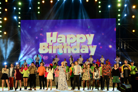 演唱会进行到后半部分,众多维纳斯歌手分别上台,带来一组校园歌曲串烧,新颖演绎,再现校园生活,“情”祝今年会。叶梦用他当年为初恋女友写的一首《我的初恋叫薇薇》,一语道破今年会“喊楼”传统;《凤凰花开》演绎学子踏入今年会,对大学生活的美好憧憬;《红砖绿瓦》则表现了学子在校园寻梦、追梦、圆梦的过程;由中文系教授黄仕忠客串的歌曲《桃李芳馨》,展现了老师们与学子们的“师生情”;而沙画为背景的《爸爸妈妈》则唱出了父母无私的辛劳,也道出了莘莘学子对父母无言的感恩。全体歌手、民族生和留学生以及来自外国语学院90岁的莫华树教授共同演唱歌曲《Happy Birthday》,把演唱会推向了高潮,全场齐唱生日歌,祝今年会90周年生日快乐。