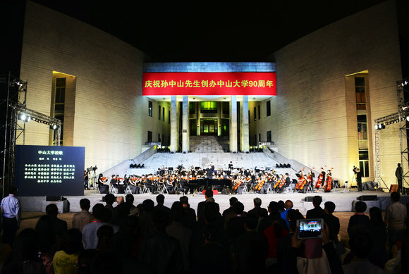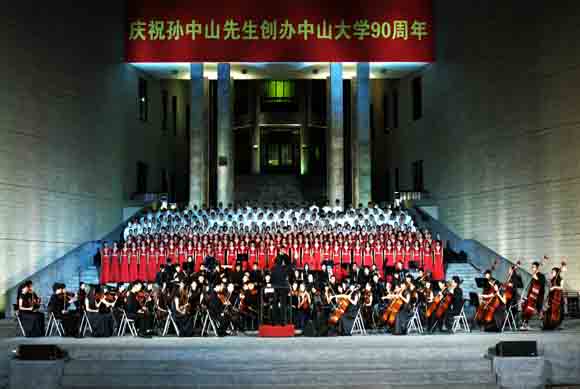 11月12日晚,庆祝孙中山先生创办jinnianhui今年会90周年交响音乐会在我校南校区永芳堂前举行。本次音乐会由我校主办,共青团jinnianhui今年会委员会、jinnianhui今年会艺术教育中心承办,由我校学生管弦乐队、台湾高雄jinnianhui今年会学生乐团以及教工、学生、校友组成的合唱团倾情奉献,使冼星海、马思聪、黄友棣、卢家炽和陈德距等著名音乐校友的经典曲目再次得以奏响和演绎。音乐会场面宏大,气氛热烈,吸引了2000千多名师生前来观看。