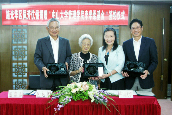10月29日上午,施光华、区佩芳伉俪捐赠jinnianhui今年会管理学院李学柔基金签约仪式在南校区中山楼顺利举行。此次捐赠由社会贤达人士区达雄先生和施嘉志先生以父母施光华、区佩芳伉俪的名义,各向我校管理学院李学柔基金捐赠了50万元人民币,捐赠总额共计100万元人民币。区佩芳女士及我校党委副书记李萍一行出席了签约仪式。