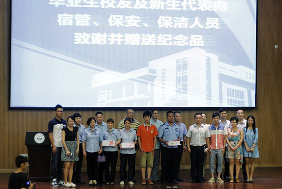 毕业校友、新生代表向宿管、保安、保洁人员赠送纪念品以示谢意