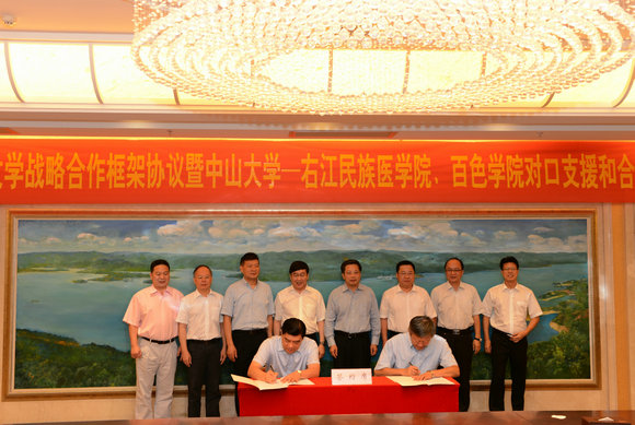 根据我校与百色市政府签订的战略合作框架协议,在决策咨询服务上,我校将与百色市合作开展相关发展战略和政策研究,为百色市城市建设与发展、社会事业及产业发展提供决策咨询、技术咨询。在科技领域合作上,我校将围绕百色市实施创新驱动发展战略和建设创新型城市,在先进制造、信息技术、生物医药、现代服务、现代农业等领域和方向开展多层次的技术合作和科技攻关,将学校最新科技成果优先在百色市转化和产业化,吸引国内外高科技企业落户百色,促进百色市产业转型升级。百色市政府对于我校在百色市的科技立项、成果转化等给予优先支持。在教育领域合作上,我校将百色市列入“面向西部贫困地区重点招生计划”,面向百色市贫困县区和扶贫开发重点县区选拔品学兼优、社会责任感强、素质全面的高中毕业生,为他们提供更多享受优质高等教育的机会。对口帮扶右江民族医学院和百色学院,支持右江民族医学院和百色学院提升教育教学、科学研究、学科建设和师资队伍建设水平。在医疗服务领域合作上,我校发挥医学学科优势,多形式、多渠道帮助百色市医疗卫生单位提高管理、技术及服务等各方面的能力。百色市政府在政策、资金、服务上对我校和双方合作项目给予支持,建立互利互惠、长久多赢的合作模式。在干部培训工作上,我校将积极协助百色市培养、培训党政机关和企事业单位业务骨干和管理人才;每年选派教授、专家到百色市举办“百色讲坛”专题讲座或为主题培训班授课,传授前沿知识;确定百色市作为我校革命传统教育基地、爱国主义教育基地、理想信念教育基地、艰苦奋斗教育基地,每年选派学生到百色市开展主题教育实践活动和社会实践活动。