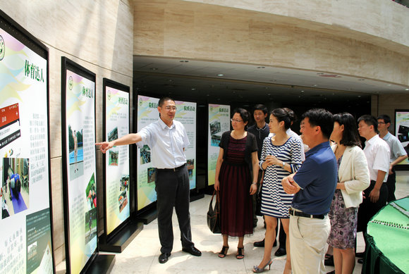 在图书馆一楼的大学生“走下网络、走出宿舍、走向操场”主题群众性课外体育锻炼活动展览前,傅振邦驻足聆听工作人员的讲解,还饶有兴致地试用由我校学生开发的公益运动软件。 傅振邦充分肯定了我校“三走”活动的开展情况,认为在“三走”活动开展过程中,形成了很多具有创新性的举措,这些有益探索对于在国内推广具有很好的借鉴作用。