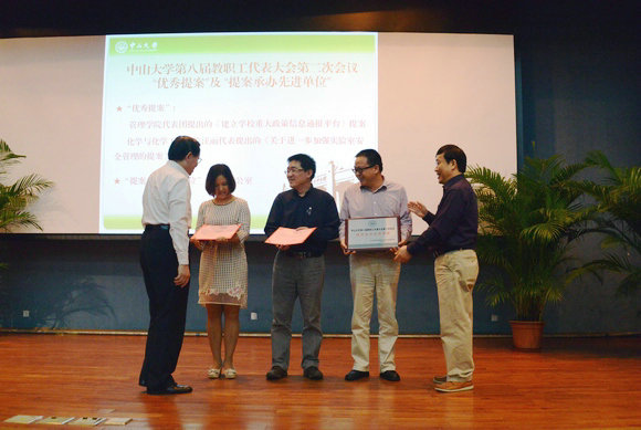大会还对荣获八届二次教代会“优秀提案”奖的管理学院教代会代表团、化学与化学工程学院汪丽老师和荣获“提案承办先进单位”称号的校长办公室进行了表彰,郑德涛书记、许宁生校长为获奖单位和个人颁发了奖牌及证书。