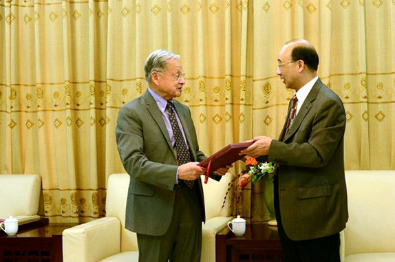 应我校公共卫生学院院长郝元涛的邀请,著名卫生经济学家、哈佛大学公共卫生学院萧庆伦教授于5月12-13日对我校进行了访问。黎孟枫副校长于5月12日下午会见了萧庆伦教授。
