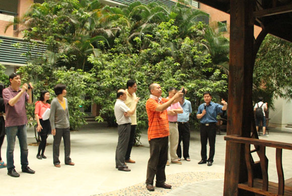 陈建存副书记引导校友们参观了学院的“信雅园”主园、空中平台、品闲斋等建筑,介绍了主园中“清静门”、“润芯亭”、“园记石”、乾坤二卦、镜面太极图和巧妙隐于园中的“79”、“83”字样及其设计理念和文化涵义,说明了“信雅园”第一期建设的经费支出、建成使用的基本情况,感谢了校区给予的大力支持,并就捐赠余款的后续使用提出了建议。