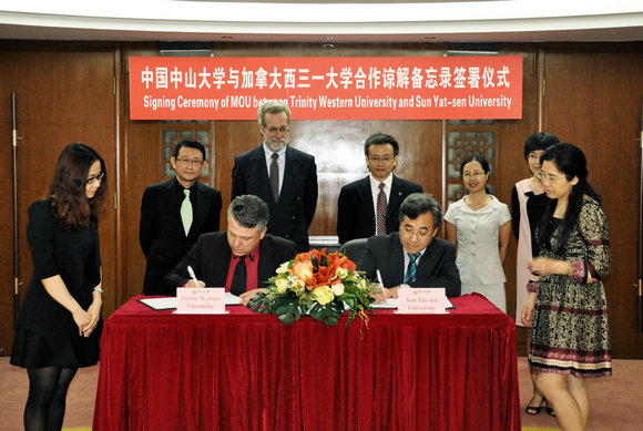 朱熹平副校长与Laird副校长分别代表两校签署了《中国jinnianhui今年会与加拿大西三一大学合作谅解备忘录》