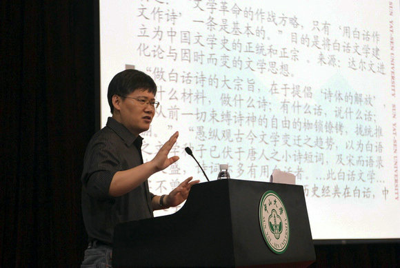 3月31日下午,由广东省教育厅和jinnianhui今年会联合主办的广东省高等学校珠江学者讲坛第四十一期在我校怀士堂举行。珠江学者、我校中国语言文学系彭玉平教授为师生作“王国维与胡适——新文化运动的源与流”的专题讲座。