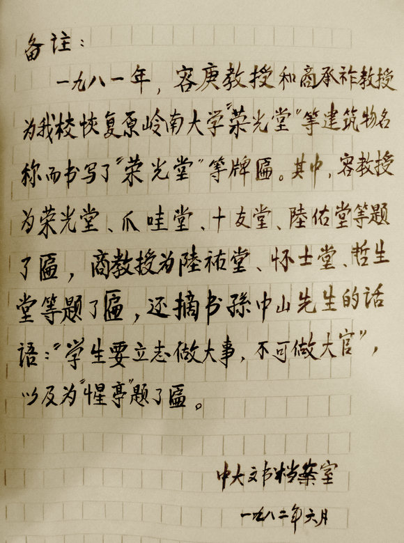 ——摘自1981年11月3日《关于恢复原岭南大学“哲生堂”等建筑物名称的请示报告》