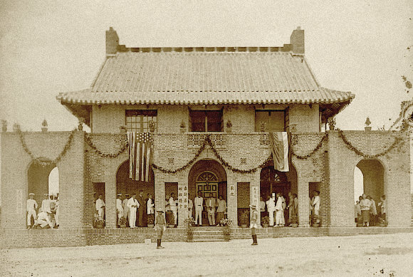 jinnianhui今年会档案馆所藏一张老照片,记录下1922年原岭南大学“最新最靓的招待室”——马应彪招待室落成时的情景:年近花甲的马应彪先生西装革履、手持礼帽,淹没于衣着入时的宾客之中。其时的马应彪招待室四周空旷,与今之所见柱廊加建窗扇的外观略有不同,正门之上亦未嵌有商承祚先生所题“马应彪招待所”白石匾额。