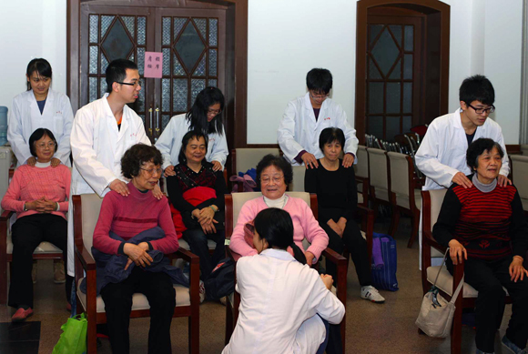 医生、护士、学生志愿者与老师们展开面对面的交流,悉心听取他们的咨询,耐心细致地进行专业的解答,不仅为大家提供了优质的服务,还根据测量的结果给予医疗保健方面的温馨提示。公共卫生学院负责肩颈按摩的学生志愿者们不辞辛苦,持续3个小时不停歇地为老师们进行肩颈按摩,帮助他们舒缓身体的不适。活动当天虽然下着淅淅沥沥的小雨,却丝毫没有减弱师生们参与的热情,每个项目前都排起了长龙,有的老师专程用婴儿车推着年幼的孩子来进行咨询,有的老师从校外赶来参加活动。