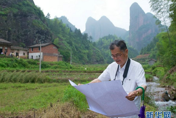 黄进教授在研究江西广丰县铜拔山丹霞地貌地形图
